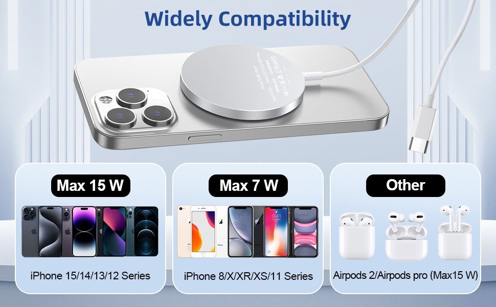 — The wireless iPhone charger is compatible with all mobile phones that support wireless charging and attaches securely to the back of your device.This iPhone charger wireless charges up to three times faster than the original 5W charger, providing a fast and safe charging experience.